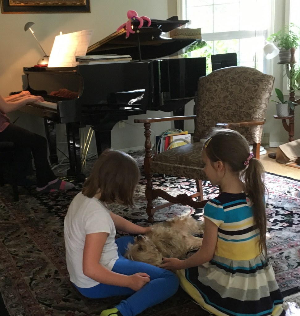 Toffee loved it when students would come to make music, and especially when siblings had to wait and could give him some undivided attention. The pandemic changed that, and he became lonely at times since students were not able to come to the house….but during online lessons Toffee could be found under the piano or on his favourite chair, listening and resting.