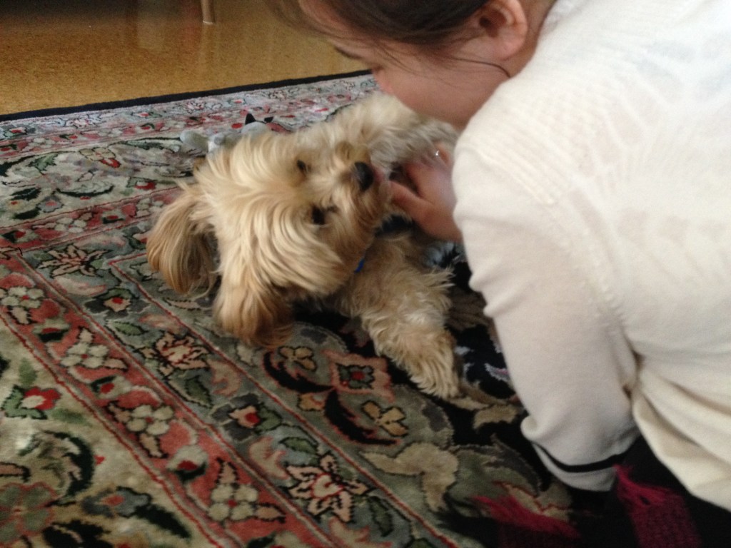 My neighbour whose two children have studied with me for several years let me know how sad they all are that Toffee is gone. Her son, when he started lessons with me was absolutely terrified of all dogs, including Toffee. For weeks Toffee knew he had to stay in his crate. Then gradually I could let him out, but hold on to the leash during the lesson. Finally one day “A” let Toffee sniff his feet. At the lesson two weeks ago I could see how much “A” had changed as the first thing he did when he came in the door was encourage Toffee to roll over for the weekly belly rub.