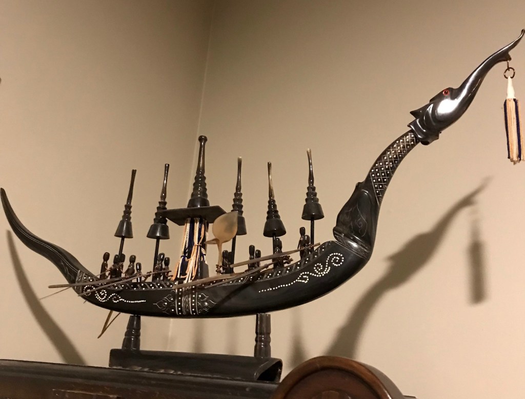 Auntie Tamada had been a widow for several years at that point, and would tell us stories about her husband. He was very creative, wrote Thai hymns, and was a Christian minister. He also assisted with one of the translations of the Bible into the Thai language. And he carved a replica of the King’s barge out of a water buffalo tusk.