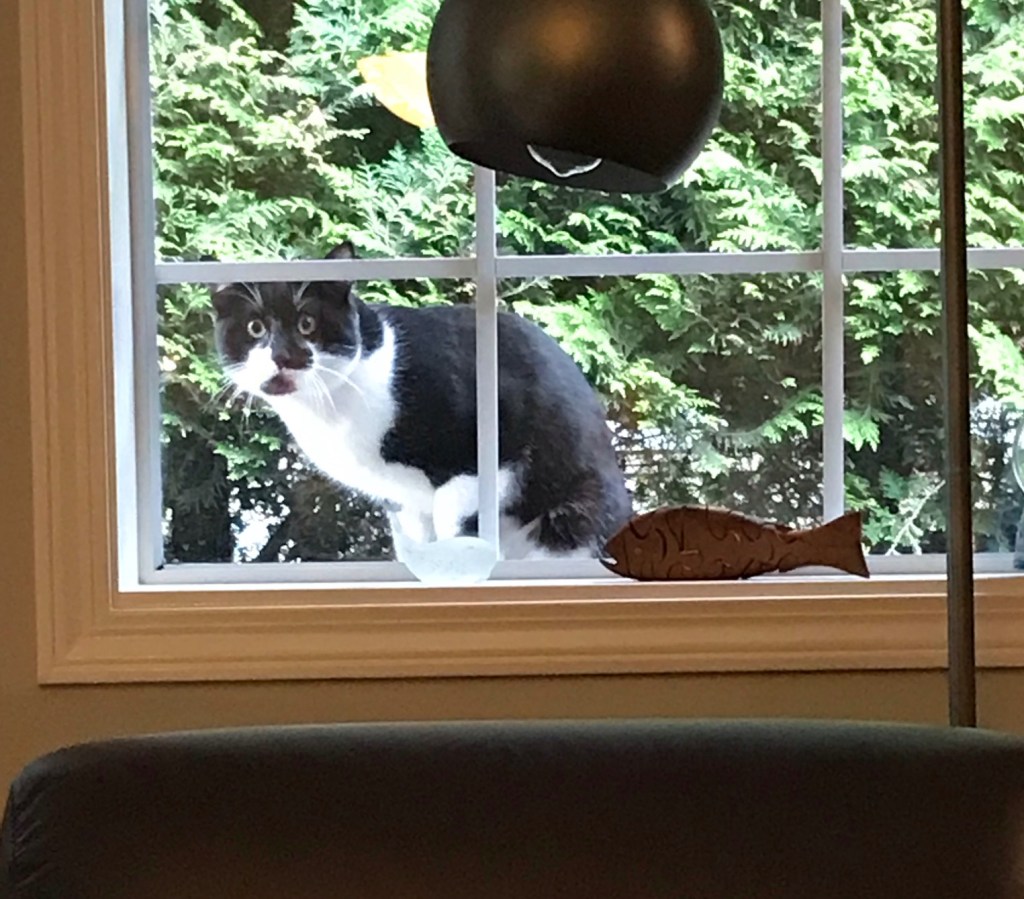 I’m getting to like having Scamp around. The window between us protects me from allergic reaction, and I get to enjoy his company and his antics.