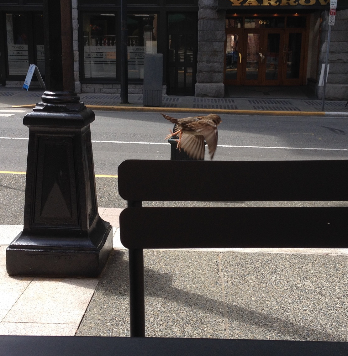 Eight years, shortly after moving here, I was sitting outside on the Starbucks patio, enjoying a coffee and chatting with a brave little bird. I believe it is a song sparrow, a species that is fairly abundant around coffee shops and cafes or any place where there might crumbs.