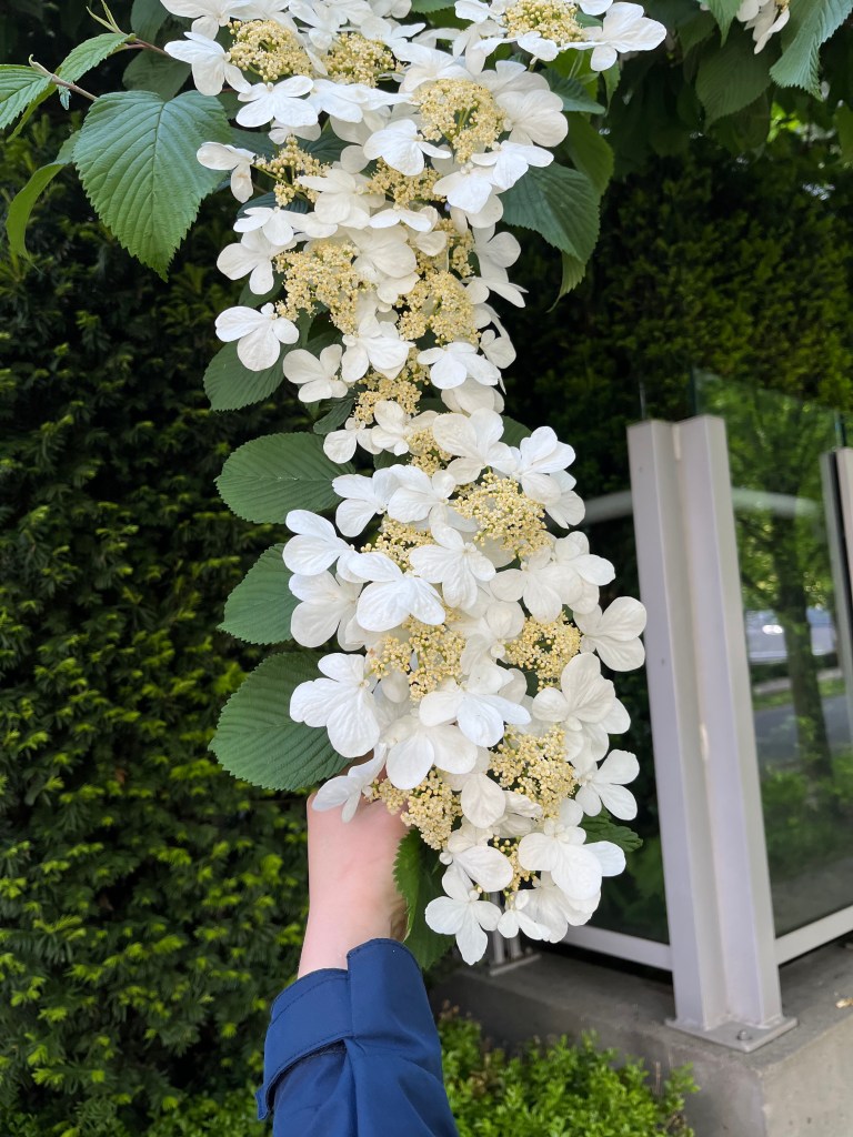 We were walking near the sea wall in Yaletown last week. This beautiful shrub caught our attention. After some research online I found more information on Viburnum plicatum Watanabe. It is native to China, Japan, Korea and Taiwan. Because it is quite resistant to disease and pests, it looks perfect. The flowers are pure white, untouched by hungry pests. The leaves are full—like a painting.