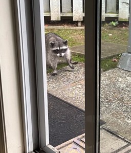 Last night I heard noises on the patio. When I rushed down to check it out, the water dish was full of dirt (from dirty paws or jaws) and my watering can was overturned. I suppose the raccoon came back for more.