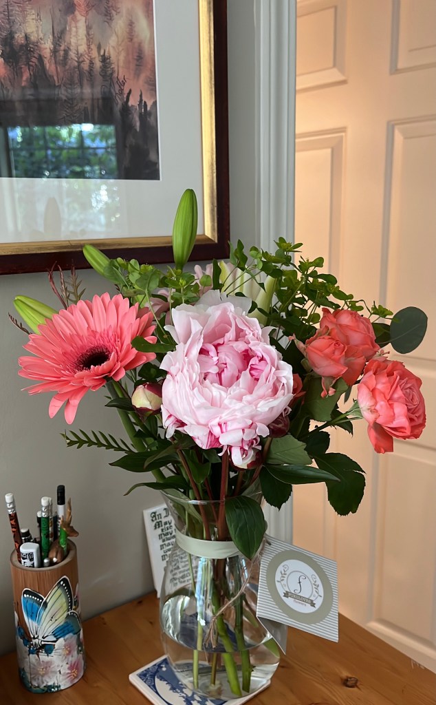 Yesterday morning these flowers were delivered to my door. Every month I receive a bouquet — a birthday gift from my children that lasts all year. Two years to be exact!