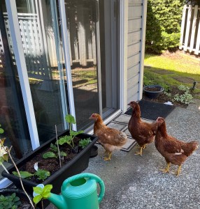 Two days ago I was in the backyard doing a bit of weeding when 6 of the neighbours hens showed up. They had a great time digging at the dirt to nibble on bugs, chasing moths and trying to be brave enough to come and peck at my pants. I went back inside to do some work, and heard knocking at the patio door. They had returned for a visit!