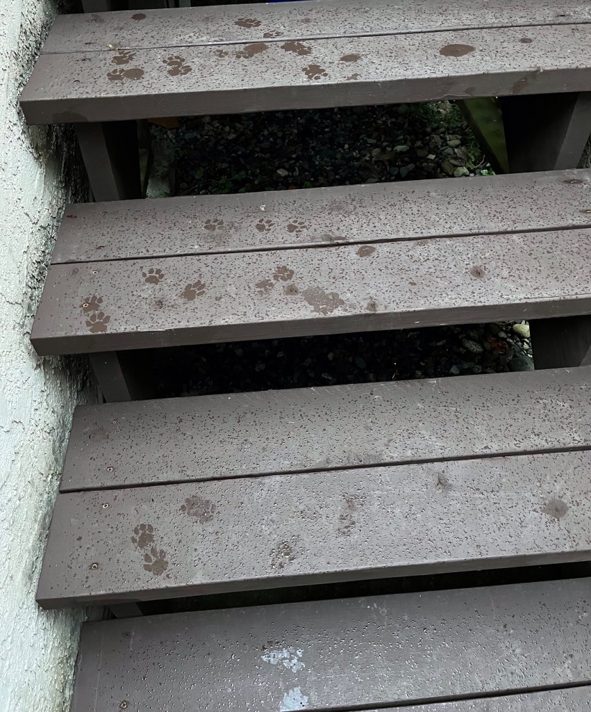 I noticed these on my neighbour’s back steps the other morning. Cats stop by at my back patio every day, but I didn’t realize that they also explored my neighbour’s balcony. Evidence of the cat or cats will disappear once the sun comes up and melts away the dew.