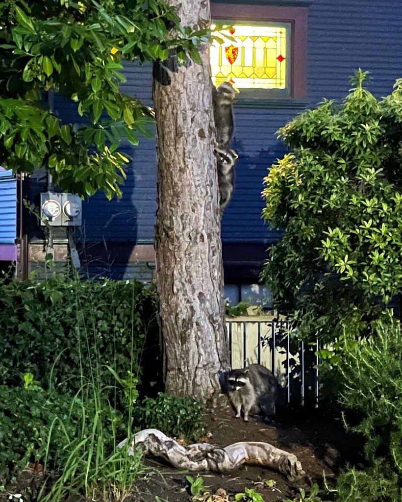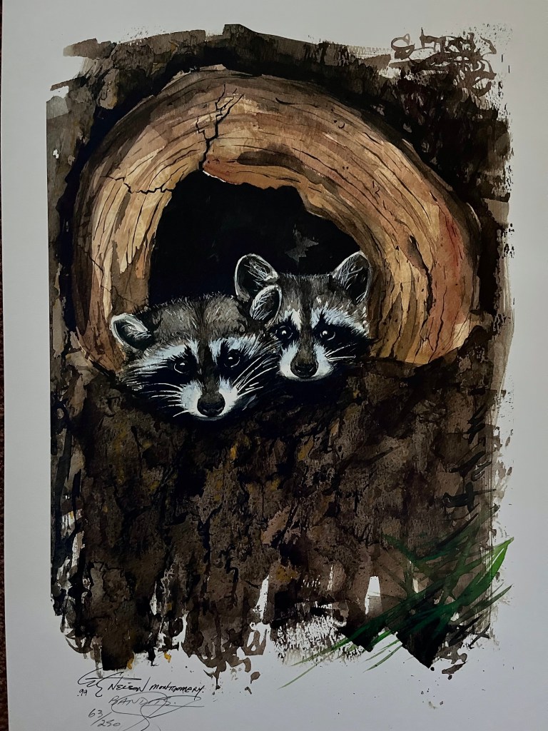 Many years ago when I lived in a different town, two young boys came to my door selling prints of paintings that their father had painted. For a very low price I bought one of two raccoons peaking out from a tree, titled “BANDITS”. At the time I had no idea how often I would be visited by these terribly cute bandits.