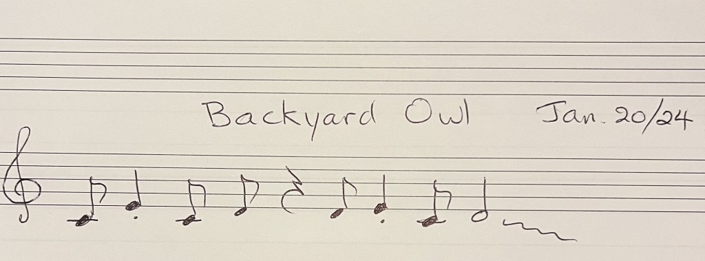 Sitting in my den with the window open a crack to let fresh air in, I hear an owl hooting. There have been reports (on Facebook) of owls in the neighbourhood, and my neighbour was convinced last summer that an owl ate an injured sparrow, but I have not heard nor seen one until today. It’s still dark out so I won’t even try to find it…I’ll just listen. “hoo-hoo – hoo – hoo, hoo-hoo – hoo – hoooooo”