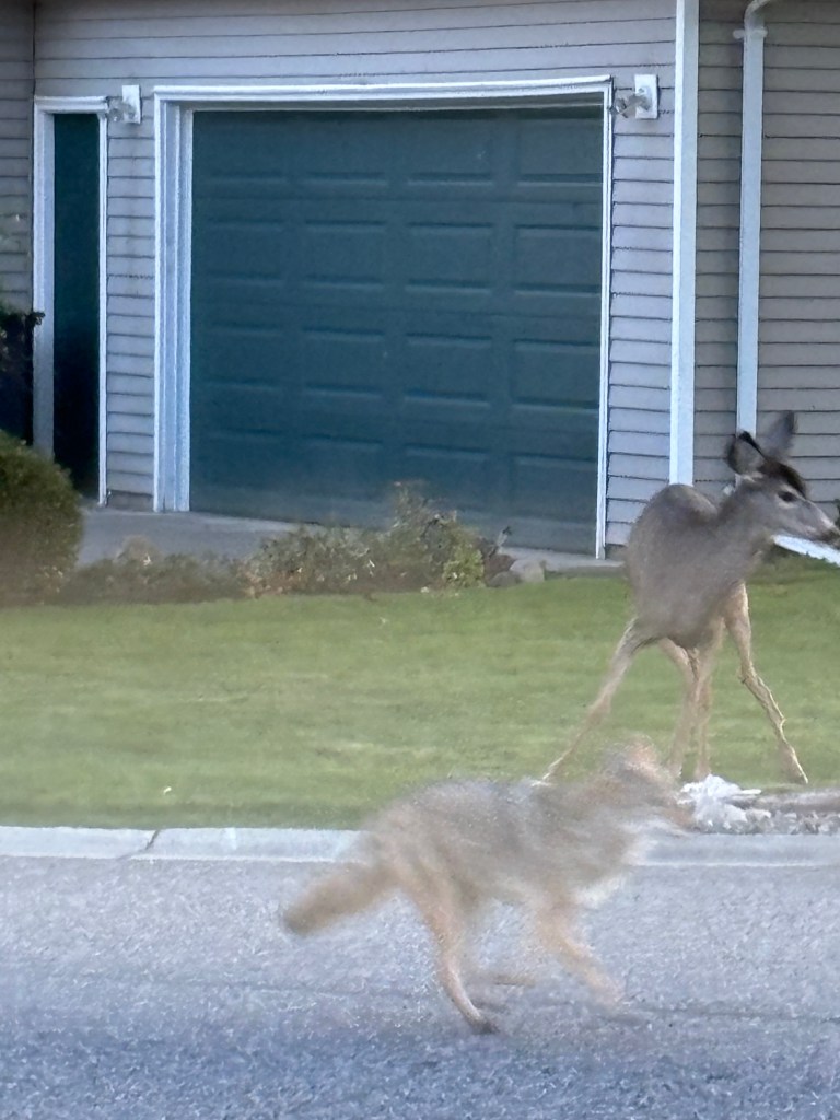 I live in the city, within a “safe” community. There are about 390 homes surrounded by a fence, with an open entrance. Behind the community is a pond with a designated wildlife sanctuary, full of ducks, geese, sparrows and other birds. It’s a beautiful area in which to walk any time of year. Last year I would walk around the pond even before the sun came up, until I heard about the packs of coyotes chasing the deer, and the deer chasing the dogs within our community.