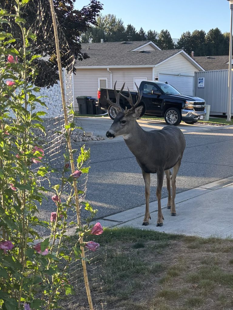 Okay, so that’s not entirely true. Just minutes before I took this photo, he was aggressively following a small dog whose owner was looking rather afraid as she led her dog to safety. Another neighbour came along, told his wife and dog to stay away while he ran into his house to grab the bear spray. It was at that point when I realized the encounter could end badly. The young mule-deer buck had no interest in my flowers, but was eyeing the cute little dog, Daisie.