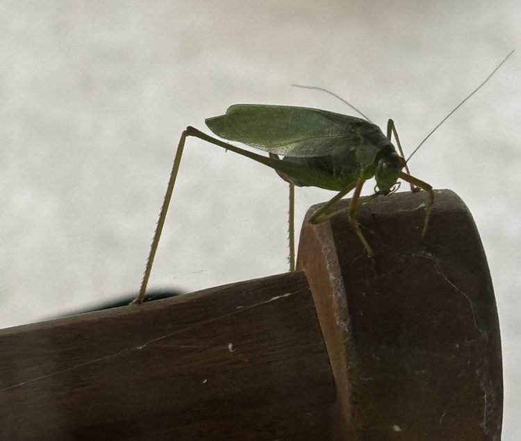 Katydids are common but rarely seen. To see one just outside my window was a treat. At first I didn’t know what it was, since I have never seen one before, but I observed it hiding in plain sight on my deck chair for well over an hour. It wasn’t startled by my presence; perhaps it couldn’t see me or sense me through the glass window. She was either grooming or eating whatever pollen she had gathered on her front legs.