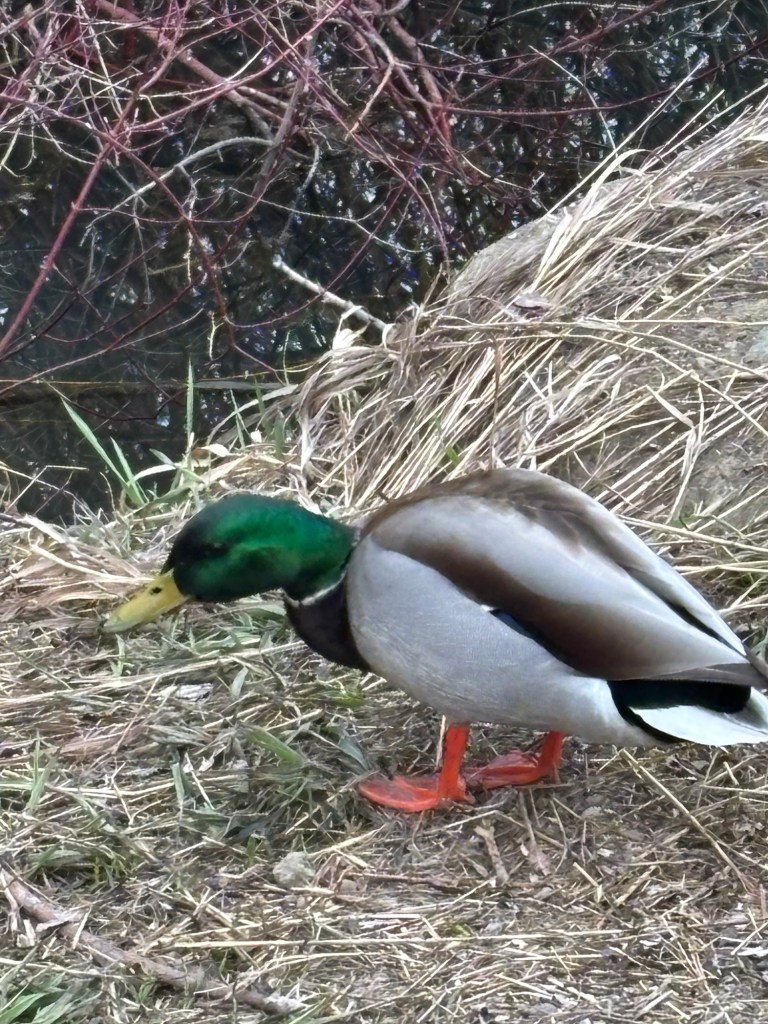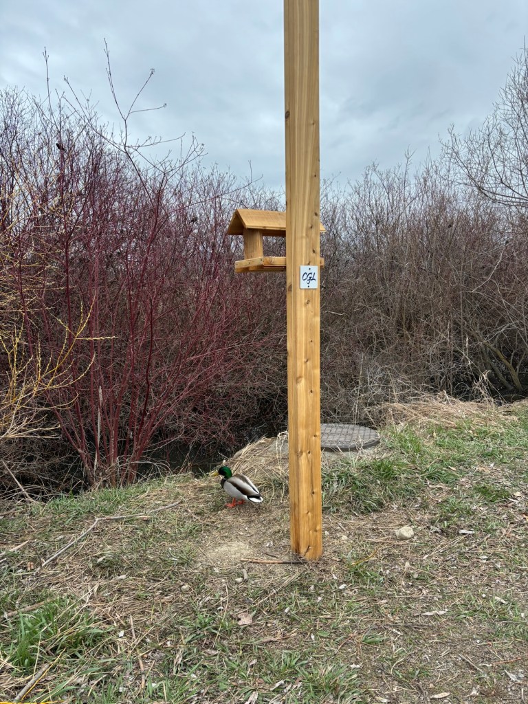 The construction company very kindly built several birdhouses and bird feeders near the construction site. In the photo above a duck was busy eating up seeds that had fallen from the feeders.