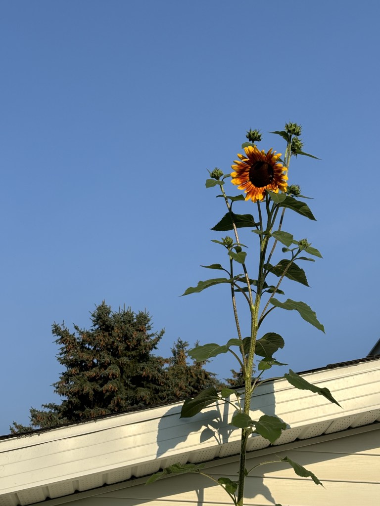 This past spring I moved to an adult community of about 390 homes. Everyone who lives here must be at least 45 years old. It’s a lovely, quiet community with rules; three pages in fact, and more each month. My sister and her husband had moved in here 3 years ago, so my decision to buy this house was a tough one. My sister does not normally understand boundaries, therefore I had to make mine very clear to her (fortunately my brother-in-law understands me very well!) without building a wall. It was difficult at first, and she struggled with the idea that she was not allowed to tell me what to do with my house, yard or life. Things are better now! We look after each other’s homes and yards when necessary. We help each other with work around the house, and with caring for mom. The sunflower in the photo above which is reaching toward the sky was growing in my sister’s garden. She has a bird netting around her garden of tomatoes, beans and sunflowers to keep the deer out, since the rules state that no permanent fencing is allowed. The deer roam and feast freely.
